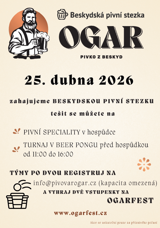 Popis: Pivovar Ogar zahajuje Beskydskou pivní stezku! Těšit se můžete na pivní speciality, turnaj v beer pongu a mnoho dalšího. Registrujte se a vyhrajte vstupenky na OGARFEST.
