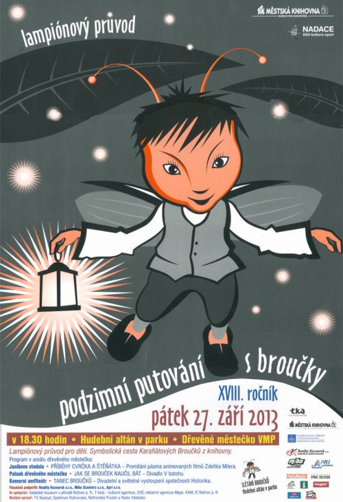Přijďte s námi prožít již 18. ročník podzimního putování s broučky v pátek 27. září 2013. Celá akce proběhne v Dřevěném městečku ve Valašském muzeu v přírodě a zahájena bude v hudebním altánu v parku.