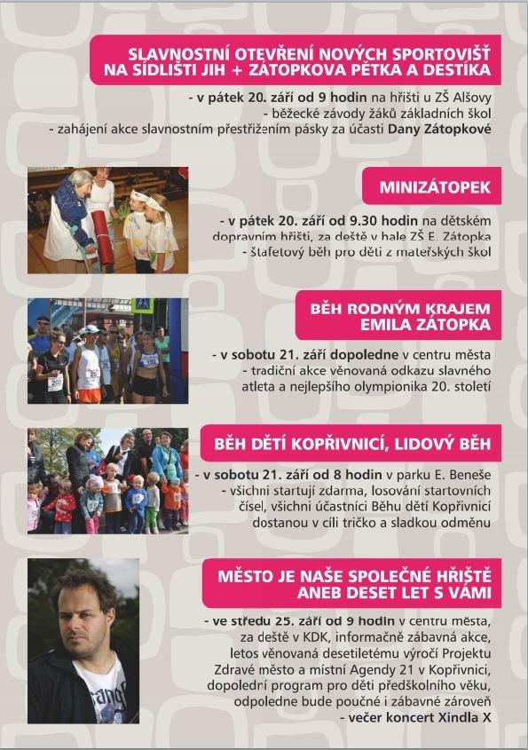 Ve středu 25. září se v centru města před kulturním domem uskuteční každoroční akce Město je naše společné hřiště. V letošním roce se zaměří nejen na představení aktuálních projektů, ale zároveň připomene desetileté výročí Zdravého města Kopřivnice. Připraven bude celodenní program plný zábavy a informací, který vyvrcholí koncertem zpěváka Xindla X.