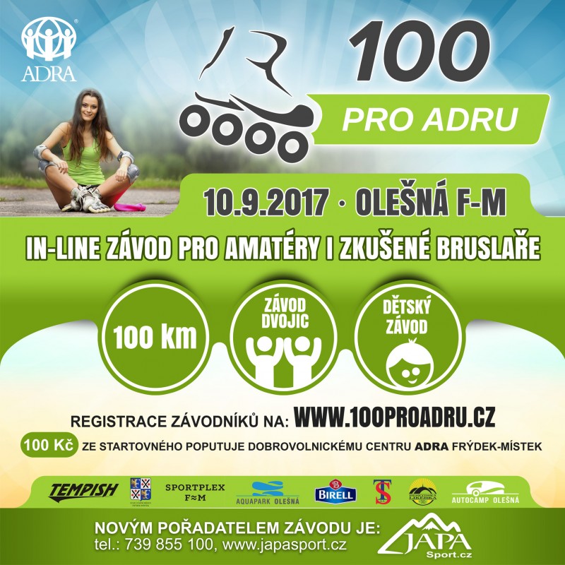 Inline závod 100 pro Adru je určen především amatérům z řad veřejnosti. Závod probíhá ve dvojicích, která může být složena ze členů stejného nebo opačného pohlaví. Délka závodu je cca 100 km, tzn. 22 kol celkem. Každý z dvojice musí ujet minimálně 1 kolo, a střídání záleží jen na vašem uvážení.