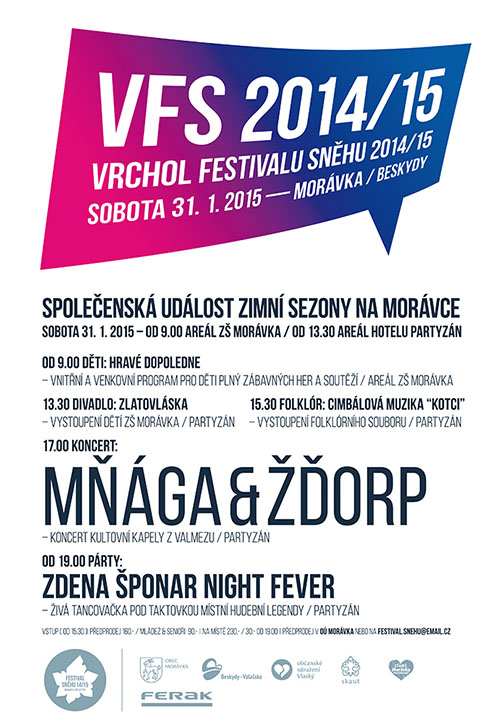 Společenská událost zimní sezony na Morávce. Celodenní akce pro všechny generace... Dopoledne bude plné soutěží a her pro děti (areál ZŠ Morávka), odpoledne a večer (hotel Partyzán) na Vás pak čeká divadelní představení Zlatovláska, cimbálová muzika KOTCI, koncert kultovní kapely z Valmezu MŇÁGA & ŽĎORP a místní hudební legenda ZDENA ŠPONAR! Podrobné info o akci najdete v menu - sekce VFS2014/15.