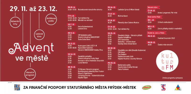 Statutární město Frýdek-Místek připravuje prostřednictvím KulturyFM zábavný „Advent ve městě“, který nabídne spoustu akcí pro děti i dospělé. Konat se budou od 29. listopadu do 23. prosince převážně na náměstí Svobody v Místku, ale také v Národním domě, Nové scéně Vlast nebo kostele sv. Jana a Pavla.