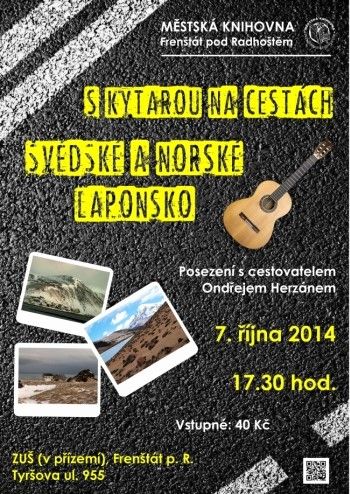 Švédské a norské Laponsko - posezení s cestovatelem dne 7. října 2014 v 17.30 hod. v prostorách ZUŠ (přízemí), Frenštát p. R. Přednáší Ondřej Herzán, cestování jej inspiruje i k psaní a skládání autorských písní. Vstupné 40 Kč.
