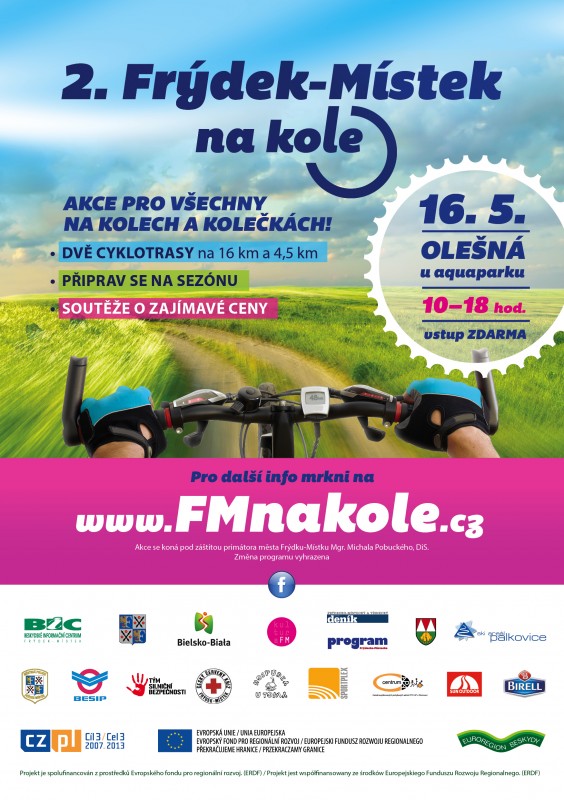 Frýdek-Místek na kole, to je pestrá přehlídka všeho, co souvisí nejen s cyklistikou, ale také se vším, co má kola a kolečka. A především pamatuje na všechny jezdce od těch nejmenších na odrážedlech, přes občasné výletníky až po zapálené sportovce. Přehrada Olešná se tak v sobotu 16. 5. 2015 přemění v ráj nejen cyklistů. Den plný sportu, zábavy a soutěží o zajímavé ceny a bohatým programem odstartuje v 10.00 hodin v areálu autokempu.