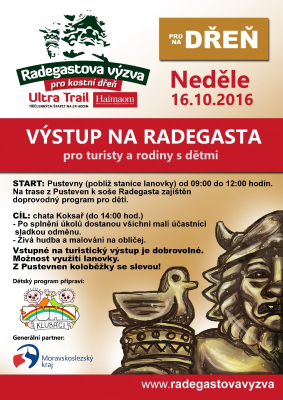 V neděli 16. října 2016 se rodiny s dětmi vydají na podzimní Výstup na Radegasta plný dobrodružství a sportovci na běžecký závod na 13 km. Svou účastí podpoří dobrou věc. Cílem organizátorů je totiž propagace a rozšíření českého registru dárců kostní dřeně, tedy oslovení nových dárců. Výtěžek z akce jde na nadaci Haimaom (na léčbu postižených leukémií).