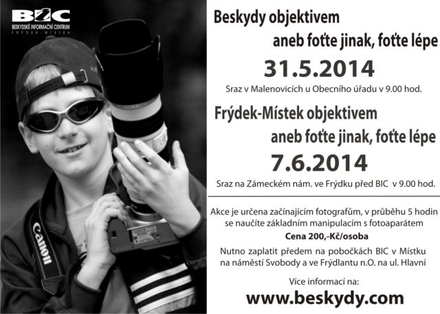 Letos poprvé můžete objevit také kouzlo fotografování. Beskydské informační centrum Frýdek-Místek totiž připravilo tématický Den s průvodcem – s fotografem. Můžete se zdokonalit ve fotografování přírody, kdy se v sobotu 31. května 2014 setkáme v Malenovicích u Obecního úřadu na akci Beskydy objektivem aneb foťte jinak, foťte lépe. Pro ty, co spíše chtějí fotit památky, je připravena akce Frýdek-Místek objektivem aneb foťte jinak, foťte lépe, která se uskuteční v sobotu 7. června 2014. Sraz tohoto průvodce bude před Beskydským informačním centrem na Zámeckém náměstí ve Frýdku. Oba tyto průvodce začínají v 9.00 hodin a je nutné je objednat a zaplatit předem. Cena činí 200,-Kč a je možné ji uhradit v Beskydském informačním centrum v Místku na náměstí Svobody nebo ve Frýdlantu n. O. na ulici Hlavní.