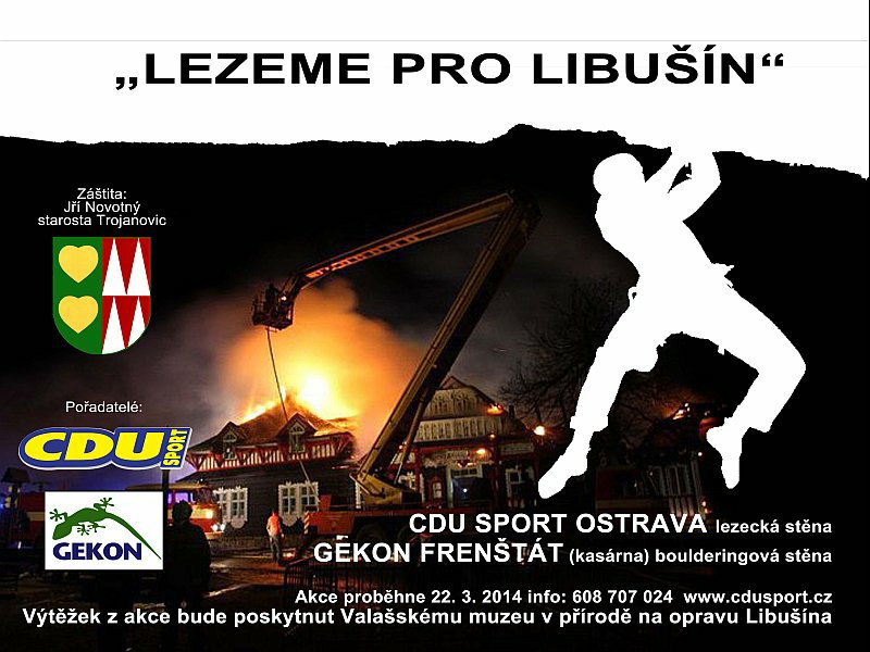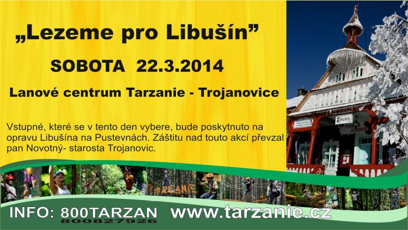 22. března přijďte do lanového centra Tarzanie a na lezecké stěny ve Frenštátě p.R. a Ostravě a lezte pro dobrou věc. Vstupné, které se vybere v tento den, bude věnováno Valašskému muzeu v přírodě na opravu Libušína.