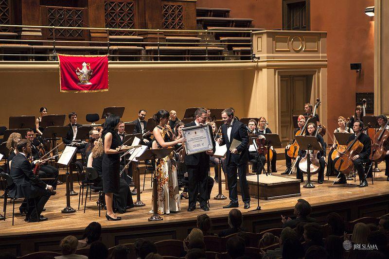 Koncert byl zahájen lidsky laděným, vkusným a přesvědčivými emocemi protkaným projevem patrona koncertu, senátora PČR Marcela Chládka - předsedy Výboru pro vzdělávání, vědu, kulturu, lidská práva a petice. Spolu s patronem koncertu přišel na pódium Dvořákovy síně také zástupce Frenštátu pod Radhoštěm Marian Žárský. Následovala slova díků vůči obecenstvu v Rudolfinu. Zástupce orchestru Lenka Dandová a senátor poté předali symbolický šek na 100.000,- Kč. Orchestr naopak dostal jako symbol díků od zástupce města čerstvě upečený valašský frgál s pečetí Frenštátu pod Radhoštěm.
