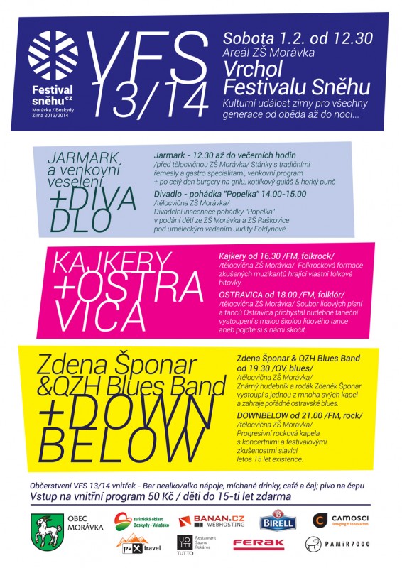 Přijďte se všichni bavit a užít si sobotu plnou hrátek na sněhu a dalších radovánek a zážitků. V rámci celodenního programu bude vztyčen hlavní symbol festivalu — obří sněhulák. Dále na vás čeká bohatý doprovodný program (soutěže, jarmark, živá hudba, kulturní program aj.). Máte se na co těšit!