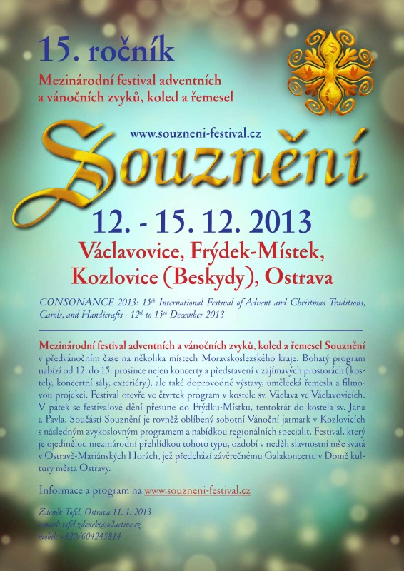 Do jubilejního hávu se letos od 12. do 15. prosince oblékne festival Souznění. Patnáctý ročník mezinárodního festivalu adventních a vánočních zvyků, koled a řemesel uvítá v předvánočním čase na několika místech Moravskoslezského kraje například hosty z Izraele, národopisný soubor z Chodska slavící osmdesát let své existence nebo slovenskou kapelu, která excelovala po boku Richarda Müllera.