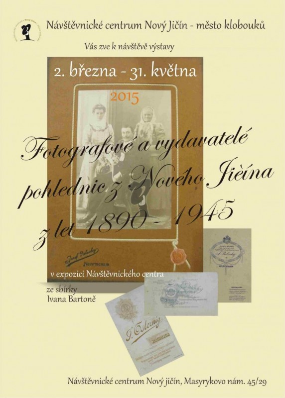 Návštěvnické centrum Nový Jičín si Vás dovoluje pozvat na výstavu "Fotografové a vydavatelé pohlednic z Nového Jičína z let 1890 - 1945" ze sbírky Ivana Bartoně. Výstava proběhne v expozici NCNJ od 2. března do 31. května 2015. Vstupné dle platného ceníku.