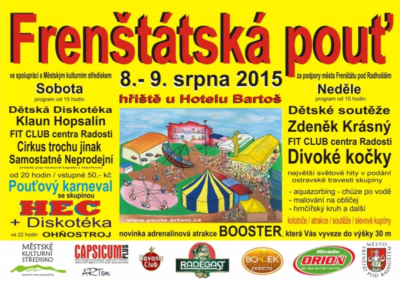 Tradiční víkendový maraton zábavy zažijete 8. – 9. srpna na hřišti u hotelu Bartoš. Ve spolupráci s Městským kulturním střediskem a za podpory města Frenštátu pod Radhoštěm se můžete těšit na kolotoče, atrakce, stánky, soutěže, vystoupení umělců i nefalšovaný pouťový karneval.