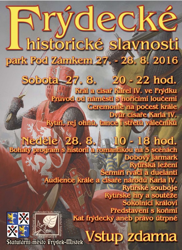 Frýdecké historické slavnosti již tradičně ukončí prázdninové Veseléto. Park Pod Zámkem bude poslední srpnový víkend patřit rytířům na koních, zbrojnošům, kejklířům, komediantům i tanečníkům a muzikantům. Chybět nebude ani bohatý dobový jarmark, soutěže a hry pro děti. Letos bude program ve znamení mezinárodních oslav sedmistého výročí od narození Karla IV - Otce vlasti, krále českého a císaře římského. Už v sobotu večer se za světel loučí uskuteční ceremonie na jeho počest. V neděli od 10 do 18 hodin bude program pokračovat. Vstup je ZDARMA.