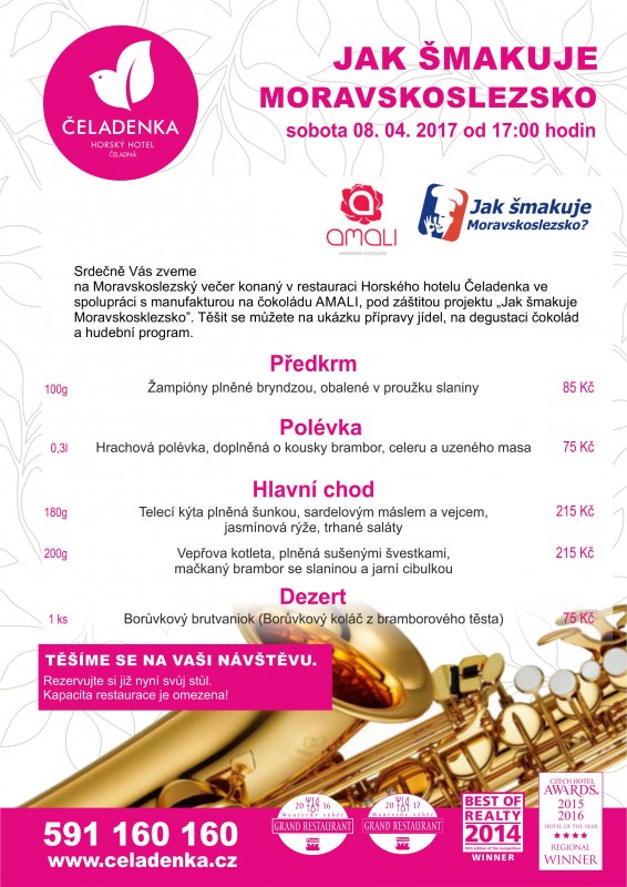 Nenechte si ujít další degustační večer v horském hotelu Čeladenka v Čeladné. V sobotu 8. dubna 2017 od 17:00 hodin budete moci shlédnout přípravu tradičních moravskoslezských pokrmů, které bude prezentovat šéfkuchař Horského hotelu Čeladenka Marek Petržela. Večer bude okořeněn ochutnávkou skvělých čokolád z produkce manufaktury AMALI a nevšední atmosféra bude oživena tóny z klarinetu či saxofonu.
