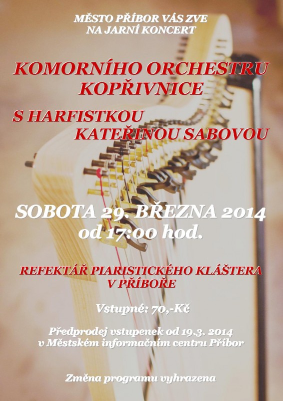 Již tuto sobotu od 17:00 hodin se uskuteční v refektáři piaristického kláštěra v Příboře jarní koncert „Komorního orchestru Kopřivnice a harfistky kateřiny Sabové“.