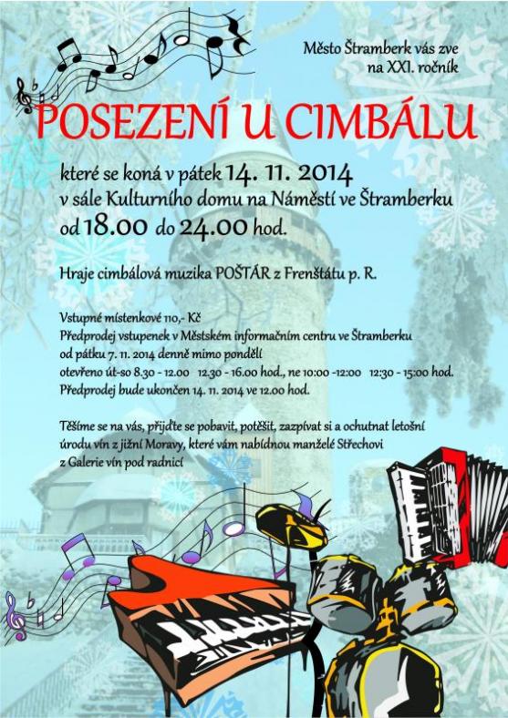V pátek se také koná XXI. ročník Posezení u cimbálu. V sále Kulturního domu na Náměstí ve Štramberku zahraje v době od 18.00 do 24.00 hodin cimbálová muzika POŠTÁR z Frenštátu pod Radhoštěm. Místenkové vstupenky seženete za 110 Kč v Městském informačním centru ve Štramberku.