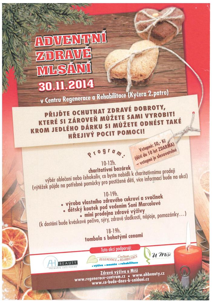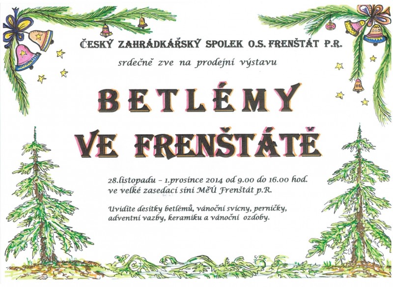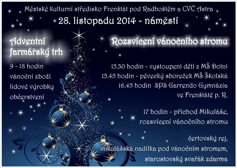 V zasedací síni Městského úřadu můžete navštívit prodejní výstavu Betlémy ve Frenštátě, poté můžete zamířit na náměstí a užít si rozsvěcování vánočního stromu a v neděli v Centru regenerace a relaxace můžete ochutnat zdravé mlsání!