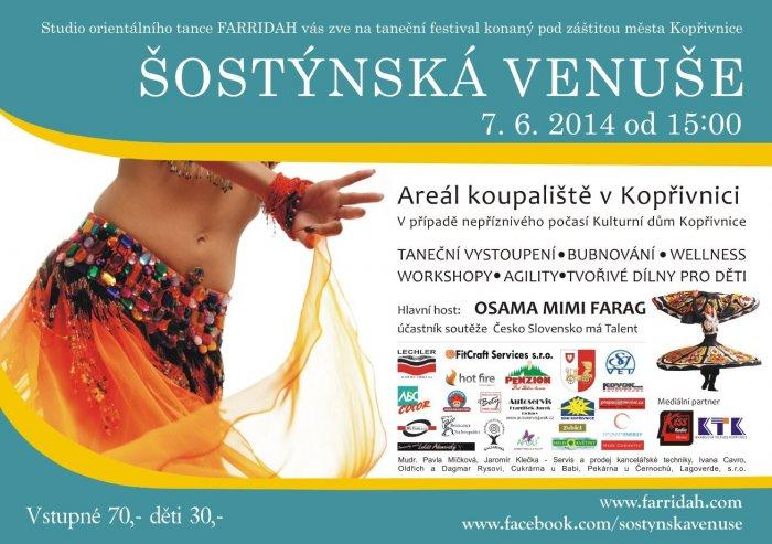 Studio orientálního tance FARRIDAH pořádá v sobotu od 15.00 hodin taneční festival Šostýnská Venuše. Program bude opravdu bohatý - taneční vystoupení, bubnování, wellness, workshopy, agility i tvořivé dílny pro děti zaplní prostory letního koupaliště v Kopřivnici. Hlavním hostem akce bude Osama Mimi Farag - účastník soutěže Česko Slovensko má Talent.