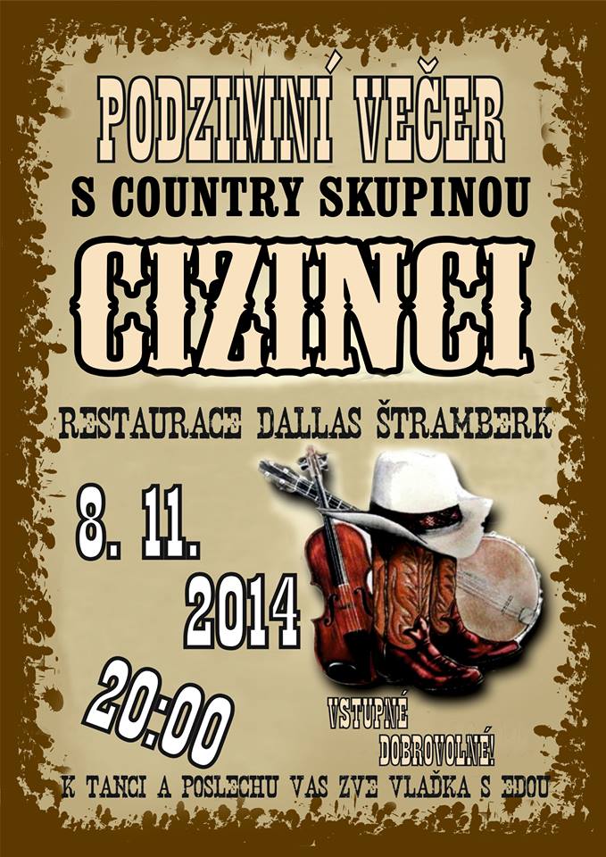 A ti co mají rádi country hudbu jsou vítáni v restauraci Dallas ve Štramberku. V sobotu od 20.00 hodin se zde rozjede Podzimní večer s country skupinou Cizinci. Kovbojský klobouk s sebou!