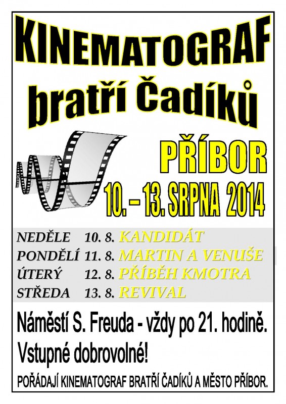 Tradiční filmové léto s „KINEMATOGRAFEM BRATŘÍ ČADÍKŮ“ se ve městě Příboře uskuteční od neděle 10. srpna do středy 13. srpna 2014.