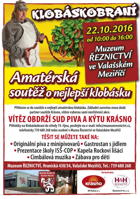 Soutěží o nejlepší klobásku a dalším bohatým programem ožije v sobotu 22. října Muzeum řeznictví Valašské Meziříčí. Amatérští řezníci se zde utkají před očima návštěvníků o titul krále valašskomeziříčského Klobáskobraní, soutěž je určena všem fanouškům řeznického řemesla, na vítěze čeká sud piva a kýta z MP Krásno, partnera soutěže.