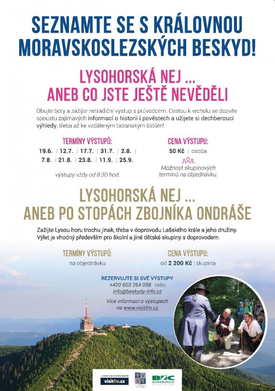 V neděli 19. června v 8.30 hodin odstartuje od lanového centra Opičárna na Ostravici už pátý ročník Lysohorských nej. Pod tímto názvem se skrývají komentované výstupy na Lysou horu, které organizuje Beskydské informační centrum Frýdek-Místek. Výstupy provázené vyprávěním o historii zdejších turistických chat, místních legendách a také o vlastních zkušenostech průvodců budou pokračovat až do poloviny září. Určeny jsou turistům od 4 do 99 let. „Na komentované výstupy, které se konají vždy v neděli a v úterý, se mohou přihlásit jednotlivci i větší skupiny, jimž jsme schopni nabídnout také individuální termín,” říká Dagmar Janovská z Beskydského informačního centra Frýdek-Místek a dodává, že součástí zhruba šestikilometrové cesty na nejvyšší vrchol Moravskoslezských Beskyd je sedm zastávek na zajímavých místech trasy. „Kromě zmíněných vycházek organizujeme výstup na Lysou horu i pro školáky, které doprovází Lašský král se svojí družinou. Tato dobrodružná výprava, kterou je třeba rovněž dopředu objednat, má u školních výletů obrovský úspěch,” uzavírá Dagmar Janovská.