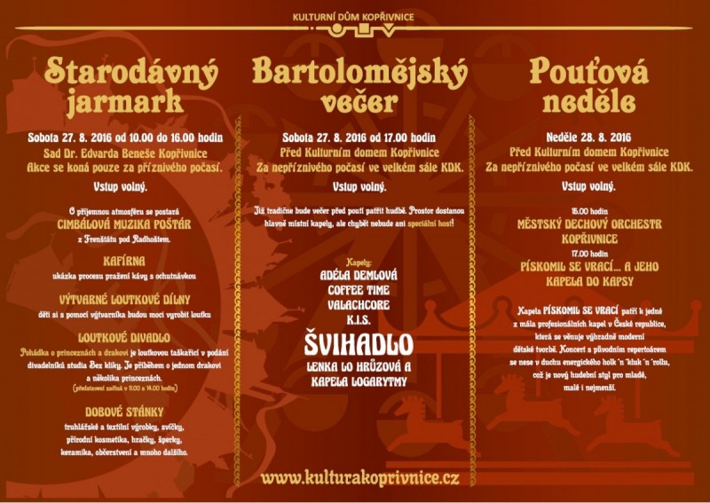 BARTOLOMĚJSKÝ VEČER – také v sobotu 27. srpna, ale tentokrát před Kulturním domem Kopřivnice, bude připravena akce hudební akce s názvem Bartolomějský večer. V rámci této akce vystoupí kapely Coffee time, Adéla Demlová, Valachcore, K.I.S., Švihadlo, Lenka Lo Hrůzová a kapela Logarytmy. V případě nepříznivého počasí se akce přesouvá do velkého sálu KDK. Vstup volný.