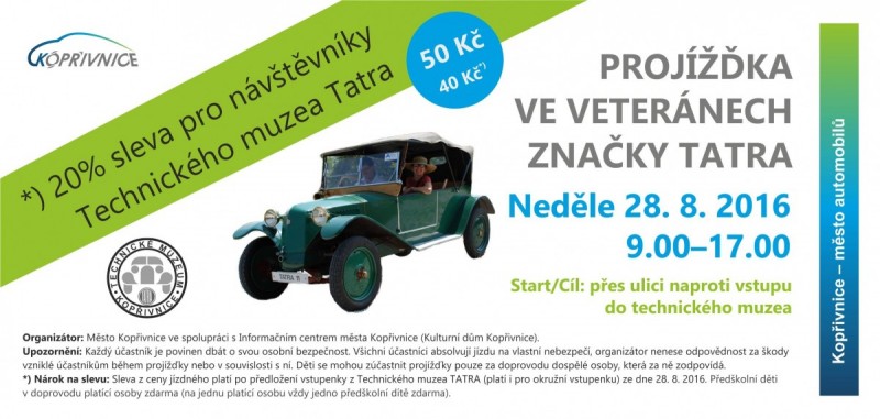 PROJÍŽĎKA VE VETERÁNECH ZNAČKY TATRA - město Kopřivnice ve spolupráci s Informačním centrem města Kopřivnice vás zvou na neděli 28. srpna na projížďku ve veteránech značky Tatra. Vyjížďky budou probíhat od 09.00 do 17.00 hodin. Start a cíl se bude nacházet přes ulici, naproti vstupu do Technického muzea. Cena jízdného je 50 Kč, ale pokud zavítáte tento den i do Technického muzea Tatra, tak získáte 20 % slevu z jízdného. Více informací v IC Kopřivnice nebo tel.: 556 821 600, 774 668 001.