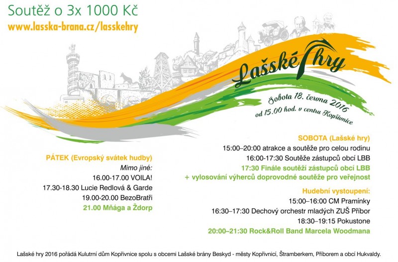 Letošní ročník Lašských her se uskuteční v sobotu 18. 6. 2016 v centru Kopřivnice. Kromě bohatého kulturního programu a zábavy pro celou rodinu je pro vás připravena doprovodná soutěž o 3x 1000 Kč.