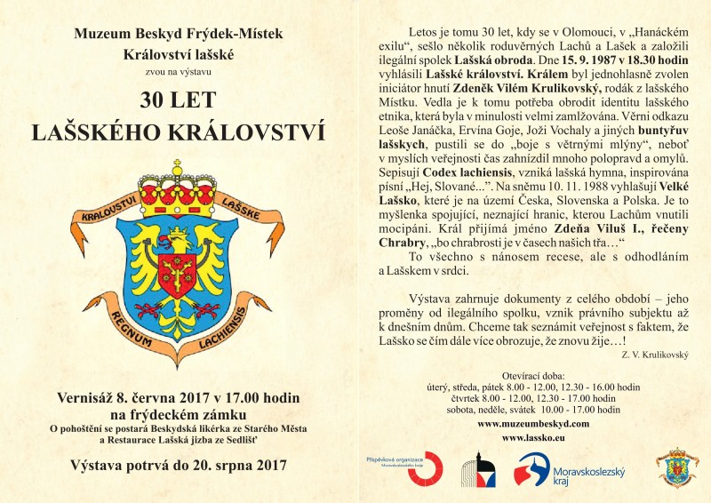 Přijďte si připomenout toto období na frýdecký zámek, kdy 8. června bude zahájena výstava 30 let Lašského království. Vernisáž se uskuteční v 17.00 hodin a výstava potrvá do 20. srpna 2017.