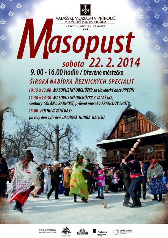 V sobotu 22. února 2014 můžete navštívit od 9:00 hod. Valašské muzeum v přírodě, kde na Vás čeká široká nabídka řeznických specialit, Masopustní obchůzky, pochovávání basy a celý den bude vyhrávat dechová hudba Galička. Tak neváhejte a dorazte!