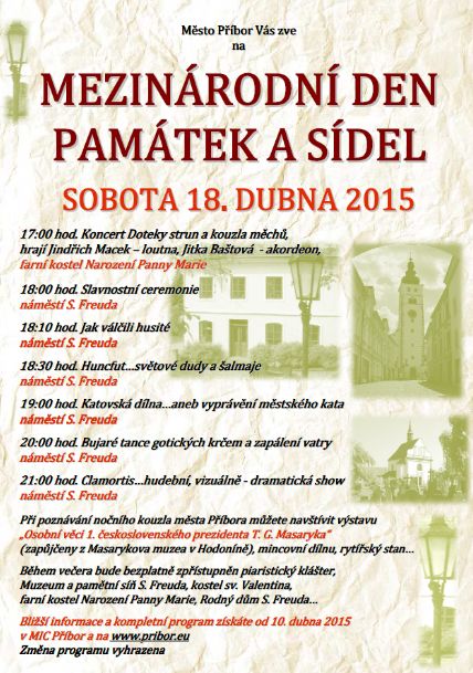 Město Příbor Vás zve na akci ,,MEZINÁRODNÍ DEN PAMÁTEK A SÍDEL“, která se uskuteční v sobotu 18. dubna 2015 v 17:00 hodin ve farním kostele Narození Panny Marie a od 18:00 hodin na náměstí Sigmunda Freuda.