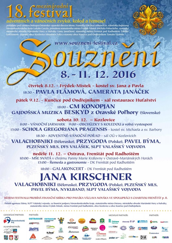 Finále mezinárodního festivalu Souznění, které se uskuteční od 18 hodin v DK ve Frenštátě pod Radhoštěm, bude patřit uznávané slovenské zpěvačce Janě Kirschner, žijící v současné době v Londýně. „Janka Kirschner, původem ze slovenského Martina, není jen půvabná mladá žena v minulosti slavící úspěch v soutěži ženské krásy, ale hlavně výborná zpěvačka i autorkou originálních písní. Věřme, že svůj přepěkný koncert doplní společně s doprovodnou kapelou svátečními písněmi, ne až tak často slyšenými. Těšme se na pohlazení pro uši i na duši,“ říká Zdeněk Tofel. Nejdříve ale v první části Galakoncertu vystoupí běloruský soubor Valachobniki, Plzeňský MLS, SLPT Valašský vojvoda, zpěvačka Petra Klementová s mladičkou dcerou Sofií, folkový zpěvák a kytarista Pavel Býma a Komorní sbor Nyklband. „Naše vystoupení se soustředí na koledy a písně svátečního času. Jednu koledu věnuji Pavlíkovi a hlavně všem lidem, kteří Pavlíkovi jakýmkoliv způsobem pomohli či pomáhají. Zahraji také jednu vlastní koledu,“ shrnuje kytarista Pavel Býma.