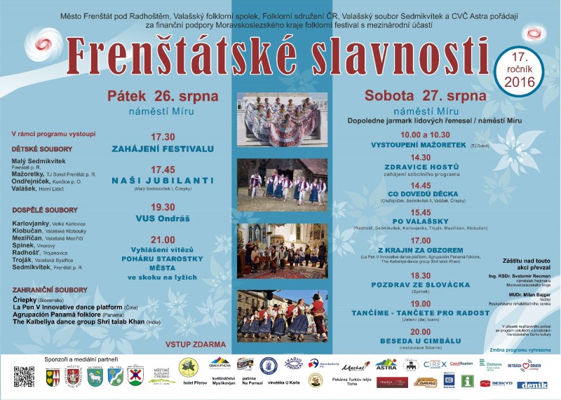 Frenštátské slavnosti budou slavnostně zahájeny o půl šesté v pátek 26. srpna. Hned poté organizátoři na pódiu ocení folklorní osobnosti v pořadu Naši jubilanti. Oceněným zahrají a zatančí soubory Malý Sedmikvítek a Čriepky. O půl osmé pak přijde na řadu hvězda večera Vojenský umělecký soubor ONDRÁŠ. Páteční program uzavře akce, která velmi hezky spojuje sport a kulturu a tou je už tradiční Vyhlášení vítězů Poháru starostky města ve skoku na lyžích. "V sobotu začínáme už od rána jarmarkem lidových řemesel na náměstí a v 10 hodin dopoledne vystoupí mažoretky TJ Sokol. Hlavní program přijde na řadu po zdravici hostů ve 14.30 hodin. Jako první tu máme moc pěkný pořad "Co dovedú děcka", kde se představí děti ze souborů Ondřejníček, malý Sedmikvítek, Valášek a Čriepky. Protože jsme na Valašsku, tak nemůže chybět pásmo našich souborů, kdy nám na pódiu zahrají a zatančí v pořadu "Po valašsky" ogaři a cérky ze souborů Radhošť, Sedmikvítek, Troják, Meziříčan a Klobůčan, no a zazpívají nám také známé Karlovjanky". Popsala ředitelka festivalu a předsedkyně Valašského folklorního spolku Jana Šamánková. Letos se pořadatelům podařilo získat také velmi atraktivní zahraniční hosty z exotických zemí. Ti vystoupí na pódiu v 17.00 hodin v pořadu "Z krajin za obzorem". Čínský taneční soubor La Pen V Innovative dance platform propaguje čínské tance v mnoha formách a díky svému umění sklízí úspěchy doma i v zahraničí. Diváci se ale mohou těšit také na další dva skvělé zahraniční soubory, The Kalbeliya dance group Shri talab Khan z Indie a Agrupación Panamá Foklore ze středoamerické Panamy. O půl sedmé večer vystoupí před frenštátským publikem slovácký soubor Spinek a od 19.00 hodin roztančí náměstí tanečníci Jelení (de) luain irskými tanci. Celý festival poté bude po 20 hodině příjemně dožívat v restauraci Siberie u besedy u cimbálu.
