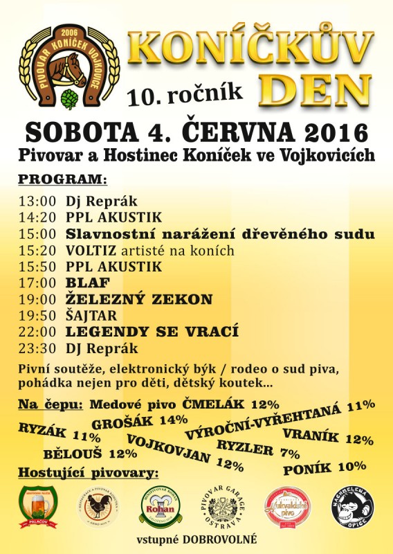 Koníčkův den s bohatým programem začne ve 13.00 hodin, slavnostní narážení dřevěného sudu pak přijde na řadu v 15.00 hodin. Lidé se můžou těšit na ukázku voltiže nebo vystoupení Železného Zekona, k poslechu zahrají kapely Blaf, Šajtar i Legendy se vrací. Program potrvá až do noci. Nebudou chybět pivní soutěže, rodeo o sud piva, pohádka nejen pro děti nebo dětský koutek. Na čepu bude pestrý výběr piv nejen z vojkovického pivovaru, ale i z několika dalších. Vstupné je dobrovolné.