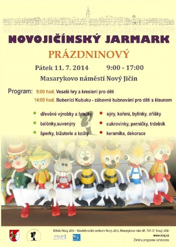 V pátek dne 11. července proběhne na Masarykově náměstí v Novém Jičíně další Novojičínský jarmark. Tentokrát "Prázdninový", kde bude možnost zakoupit cukrovinky, perníčky, trdelník, balónky a suvenýry z keramiky, dřeva, bižuterie, šperky a spoustu dalších Věcí. V rámci akce vystoupí od 14:00 hod. bubeníci KUBUKU - Zábavné bubnování s klaunem.