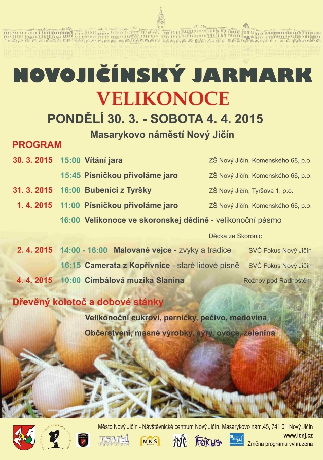 Od pondělí 30. března do soboty 4. dubna 2015, každý den od 8:00 - 17:00 hod. můžete zavítat na Masarykovo náměstí v Novém Jičíně , kde proběhne Novojičínský Velikonoční jarmark.