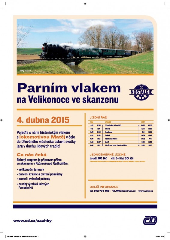 Na Bílou sobotu (4. 4. 2015) budou moci velcí i malí zájemci se z Valašského Meziříčí do Rožnova pod Radhoštěm dopravit historickým vlakem s parní lokomotivou „Matěj“ a zároveň zavítat na velikonoční muzejní program.