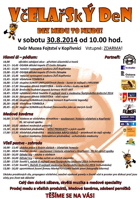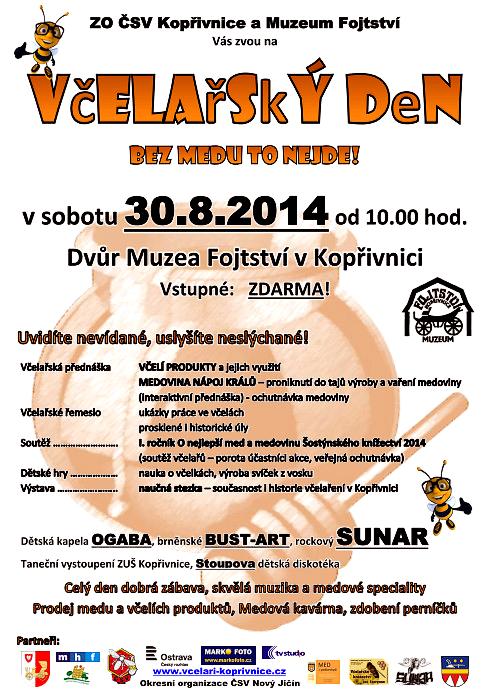 Tak to tu ještě nebylo! V sobotu se v areálu Muzea Fojtství koná první Včelařský den. Po celý den vás čeká dobrá zábava, skvělá muzika a samozřejmě medové speciality. Budete si moci koupit med nebo jiné včelí produkty, posedět si v medové kavárně nebo si nazdobit perníčky. Nouze nebude ani o hudbu a taneční vystoupení. Představí se vám dětská kapela OGABA, brněnské BUST-ART, rockový SUNAR, tanečníci ze ZUŠ Kopřivnice a diskotéku pro děti odehraje DJ Stoupa.