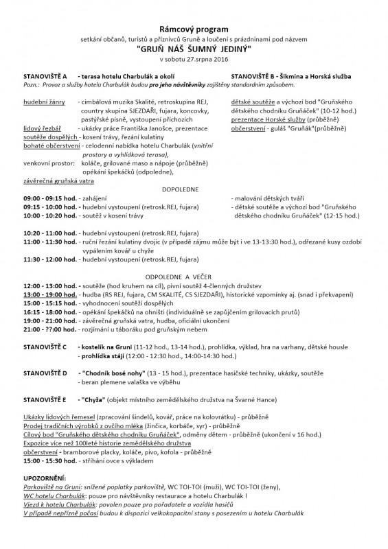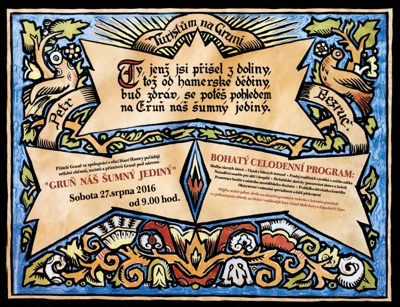 V sobotu 27. 8. 2016 od 9:00 hodin proběhne setkání příznivců Gruně s bohatým doprovodným programem, který představí místní folklór a tradice. K vidění budou ukázky lidových řemesel, prodej tradičních ovčích výrobků nebo prohlídka dřevěného kostelíku, hrát bude hudba různých žánrů, podíváte se dalekohledem na nebe, ochutnáte místní speciality a těšit se můžete i na další překvapení