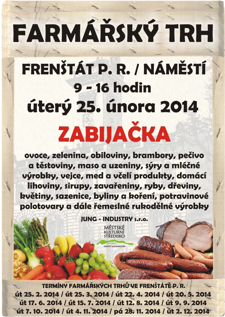 Tématem prvního farmářského trhu ve Frenštátě pod Radhoštěm je Zabijačka. Těšit se můžete na stánky s produkty ze zabijačky, ovocem a zeleninou, sýry a mléčné výrobky, med, vejce a včelí produkty a mnoho dalšího.