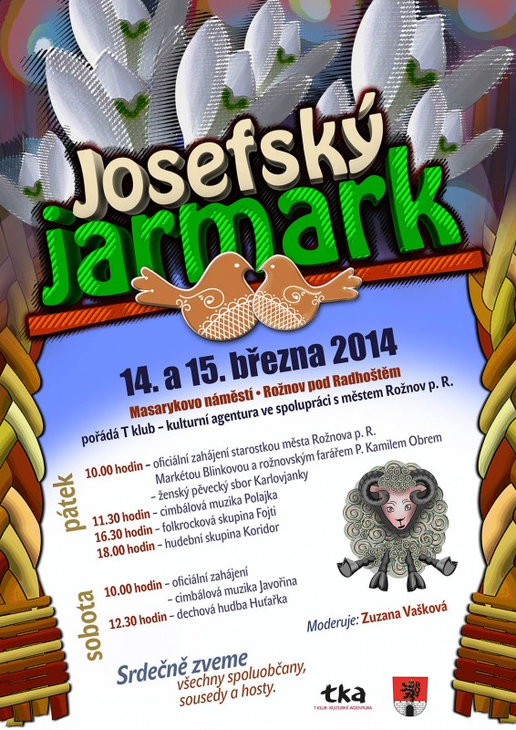 V pátek a sobotu se můžete těšit na JOSEFSKÝ JARMARK na Masarykově náměstí v Rožnově pod Radhoštěm. Množství prodejců nabídne jak tradiční jarmareční zboží tak vynikající občerstvení a mnoho dalšího. V pátek v rámci doprovodného programu vystoupí cimbálová muzika Polajka, folkrocková kapela Fojti nebo hudební skupina Koridor. V sobotu pak dechová hudba Huťařka a cimbálová muzika folklorního souboru Javořina.