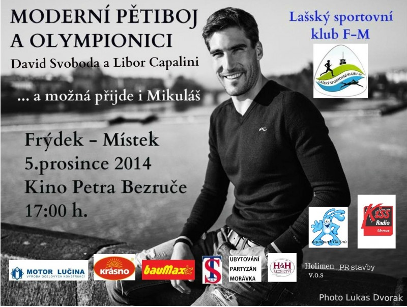 V pátek 5. prosince v kině Petra Bezruče v Místku od 17.00 hodin budou hosty – držitel mnoha medailí z MS, ME a olympijský vítěz z Londýna 2012 David Svoboda a chybět nebude ani patron frýdeckomísteckého Lašského sportovního klubu, medailemi z ME, MS ověnčený a bronzový z olympiády v Aténách 2004, Libor Capalini.