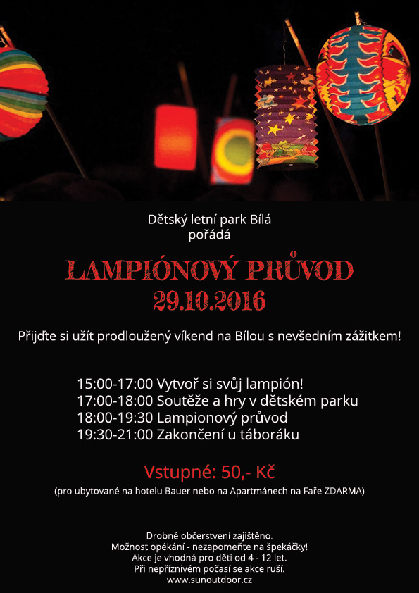 V sobotu 29. října si pak v Bílé mohou děti vytvořit svůj lampión, se kterým vyrazí do lampionového průvodu. Připraveny budou i soutěže a hry v dětském parku a zakončení akce proběhne u táboráku. Vstupné je 50,-Kč, pro ubytované v hotelu Bauer nebo v apartmánech Na Faře je vstup zdarma. Drobné občerstvení je zajištěno, je možnost i opékání špekáčků, tak si je vemte s sebou. V případě nepříznivého počasí se akce ruší.