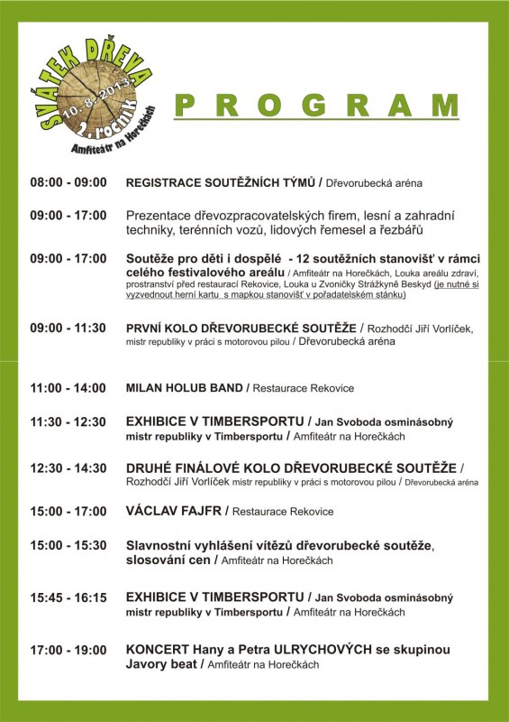 Zápolení dřevorubců, prezentace lesní a zahradní techniky, lidová řemesla a řezbáři. To a ještě mnohem více nabídne už tuto sobotu 10. srpna festival Svátek dřeva. Ten se koná druhým rokem v amfiteátru na Horečkách a přilehlém okolí. Celodenní program je doslova nabitý energií, ale také spoustou atrakcí. Na své si přijdou jak dospělí, tak i děti. Zcela nově se letos na Svátku dřeva představí také Timbersport.