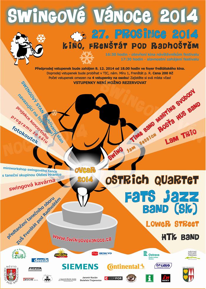 Program Swingových Vánoc 2014 je hotov – letos v Kině Frenštát! Pokud se i letos chystáte podstoupit tradiční klání o získání vstupenky na Swingové Vánoce, vězte, že Vaše úsilí bude opět bohatě odměněno. Z důvodu stále uzavřeného kulturního domu budeme sice také tento rok pracovat v režimu nouzového řešení, nicméně, tak jako loni v Trojanovicích, chceme opět připravit festival se vším, co k němu již tradičně patří. Vracíme se do Frenštátu a dokonce symbolicky do kina, kde proběhly první ročníky Swingových Vánoc. Ačkoli jeho prostory zdánlivě nejsou pro festival našeho formátu nejpříhodnější, pokusíme se návštěvníky přesvědčit o opaku. Atmosféra kina navíc poslouží jako příhodná kulisa letošního ročníku, v rámci nějž bude předána vybraným interpretům festivalová cena za umělecký přínos festivalu OVCAR ...