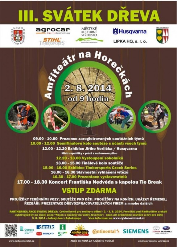 V sobotu 2. 8. 2014 od 8:00 se v Amfiteátru na Horečkách uskuteční již 3. ročník Svátku dřeva. Stěžejním bodem programu tohoto festivalu je dřevorubecká soutěž dvoučlenných týmů. Součástí programu III. ročníku Svátku dřeva bude také bohatý doprovodný program sestávající z prezentace dřevozpracovatelských firem, zahradní techniky, ale také lidových řemesel. Doprovodný program bude doplněn exhibičním vystoupením osminásobného mistra republiky v Timbersportu Jana Svobody Na závěr akce se uskuteční koncert FRANTIŠKA NEDVĚDA & TIE BREAK. Vstup zdarma.