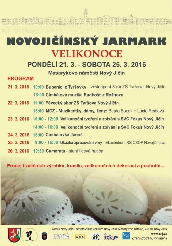 Přijďte se podívat na Novojičínský Velikonoční jarmark, který od pondělí 21. března do soboty 26. března 2016 probíhá na novojičínském náměstí každý den od 8:00 do 17:00 hodin. Jarmark nabízí nejen kulturní program a atrakce pro děti, ale také možnost zakoupnení velikonočních dekorací, kraslic, květin a ručně dělaných výrobků. Nechybí ani občerstvení, masné a uzenářské výrobky, sýry, velikonoční cukroví, pečivo a další dobroty.