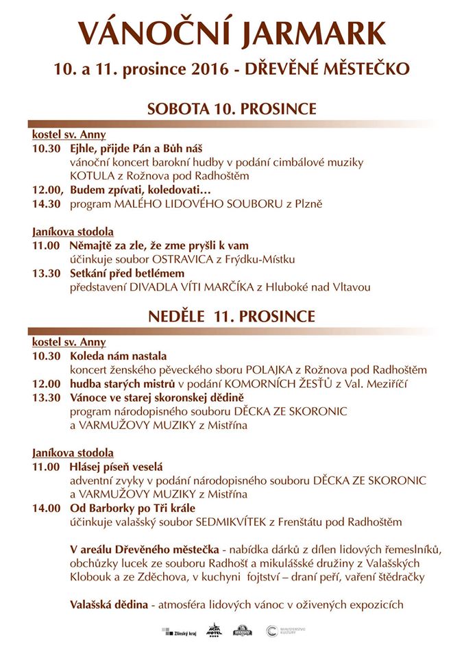 Po celé dva dny (sobota 10.12. + neděle 11.12.) je připraven bohatý program jak v Dřevěném městečku, tak Valašské dědině. K vidění a zakoupení bude pestrá nabídka dárků z dílen lidových řemeslníků. V bohatém doprovodném programu vystoupí soubory OSTRAVICA z Frýdku-Místku, SEDMIKVÍTEK z Frenštátu pod Radhoštěm, DĚCKA ZE SKORONIC a VARMUŽOVA MUZIKA z Mistřína, KOMORNÍ ŽESTĚ z Valašského Meziříčí, ženský sbor POLAJKA, cimbálová muzika KOTULA, MALÝ LIDOVÝ SOUBOR z Plzně, DIVADLO VÍTI MARČÍKA z Hluboké nad Vltavou, mikulášské družiny z Valašských Klobouk a ze Zděchova, tetičky z Hutiska a lucky z rožnovského souboru Radhošť.