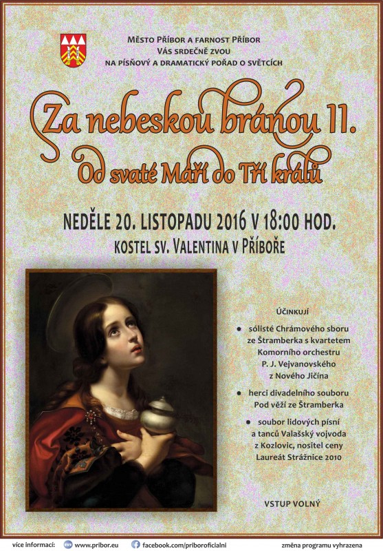 Na písňový a dramatický pořad Za nebeskou bránou II. Od svaté Máří do Tří králů se můžete vydat v neděli 20. 11. 2016 od 18.00 hod. do kostela sv. Valentina v Příboře.